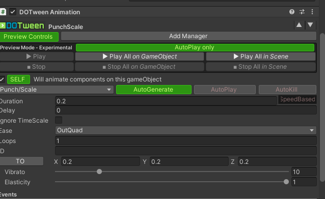 DoTween Animation 컴포넌트 추가하고 위 코드와 같이 아래 컴포넌트에서 설정하면 된다.