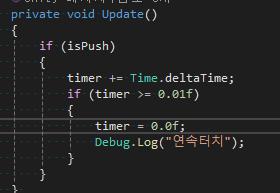 버튼을 쭉 누르고 있는 경우 코루틴이 1초가 지나 isPush를 true로 해서 update문을 타서 연속터치로 인식하는것이다.