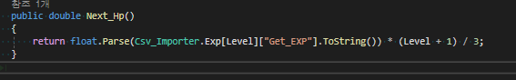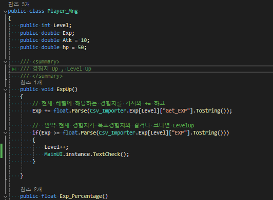- 따라서 버튼을 클릭하거나 UI에 현재 레벨 경험치 등을 보여주기 위해 데이터 접근이 필요할 때 모델인 Player_Mng로 접근하는게 핵심이고 수학적 계산을 통해 데이터를 반환하도록 하는 메서드로 이루어진 스크립트이다.