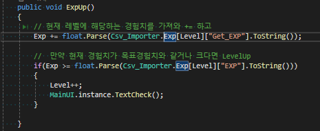 뷰에서 버튼을 누르는 등의 상호작용에 의해 ExpUP을 호출하면 아래 메서드가 실행 되는데 단순하게 경험치를 누적시키고 레벨업 조건에 부합하다면 레벨업을 한다.