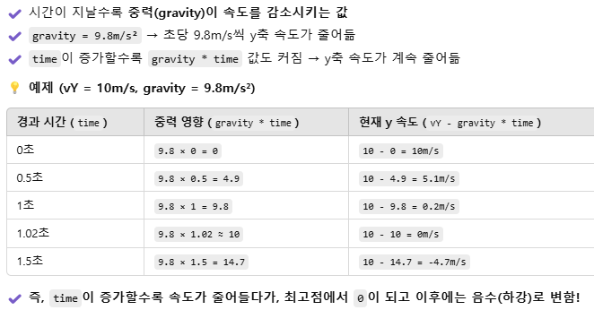 위 과정을 코드로 풀어 보면 현재 vY가 y방향 ` ★ 속도 ★ `인데 중력처리를 한다고 치면 1초에 n값만큼 vY에서 빼면 된다. 그럼 올라가는 힘이 줄어들고 음수가 되면 아래로 떨어지게 되는 원리이다.