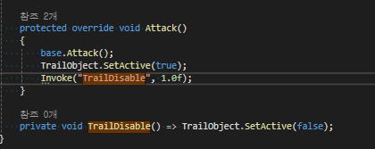 그리고 단순하게 공격 시점에 켜주고 인보크로 1초 뒤에 false 해주면 공격이 끝날 쯤에는 오브젝트가 비활성화 되어 원하는 연출이 될 것이다.