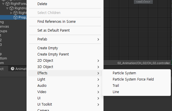 1. 무기 오브젝트 자식으로 Effects > Trail 추가