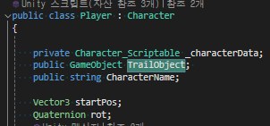해당 플레이어 오브젝트에 추가 되어있는 Player.cs 스크립트를 연 후에 TrailObject 이름의 게임오브젝트 변수를 하나 추가 한다.