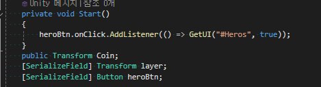 - 기존에는 하이어라키의 OnClick 이벤트를 사용해서 메서드를 호출했는데 매게변수가 2개 이상 사용 되어야 하다 보니 내가 누를 영웅 아이콘 오브젝트의 부모중에서 스크립트를 가진 Base_Canvas 스크립트에 heroBtn 이름의 버튼 변수를 하나 추가하고 클릭할 때 GetUI 메서드가 실행되도록 클릭 이벤트를 연결