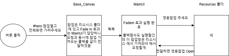 페이드 인을 하면 페이드 아웃도 같이 되어야 한다 그래서 어차피 페이드인 하고 영웅 팝업 열 때 아래 Init에서 페이드 아웃을 해버리면 자연스럽다.