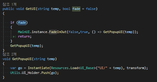 - 결론은 원래는 FadeInOut메서드 없이 바로 GetPopUI 가 실행되어 바로 팝업창을 가져와 열었는데 이 과정을 콜백으로 넣어 전달하여 FadeInOut 효과가 끝난 뒤 실행되도록 하였다.