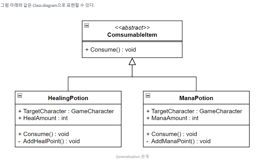 - UML에서 속이 빈 삼각형 화살표(△) 로 표현하고,