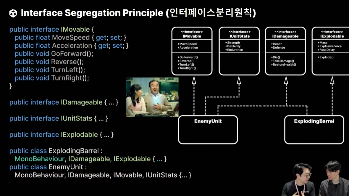 유닛을 만든다고 가정할 때 관련 기능을 인터페이스 하나에 때려넣기 식으로 작성하면 안 된다.