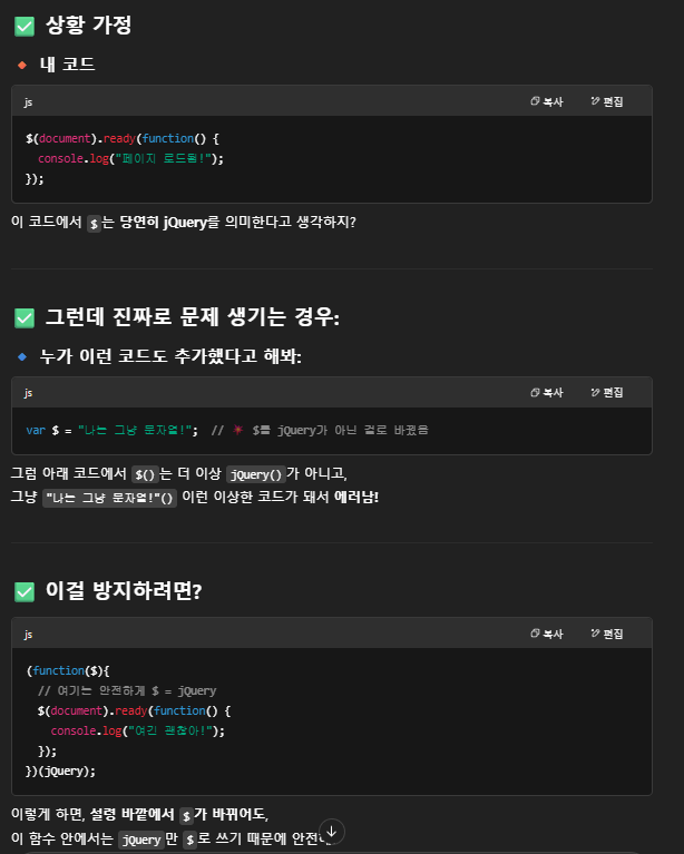 - 그래서 함수 안에서만 $를 jQuery로 고정해서 안전하게 쓰는 것